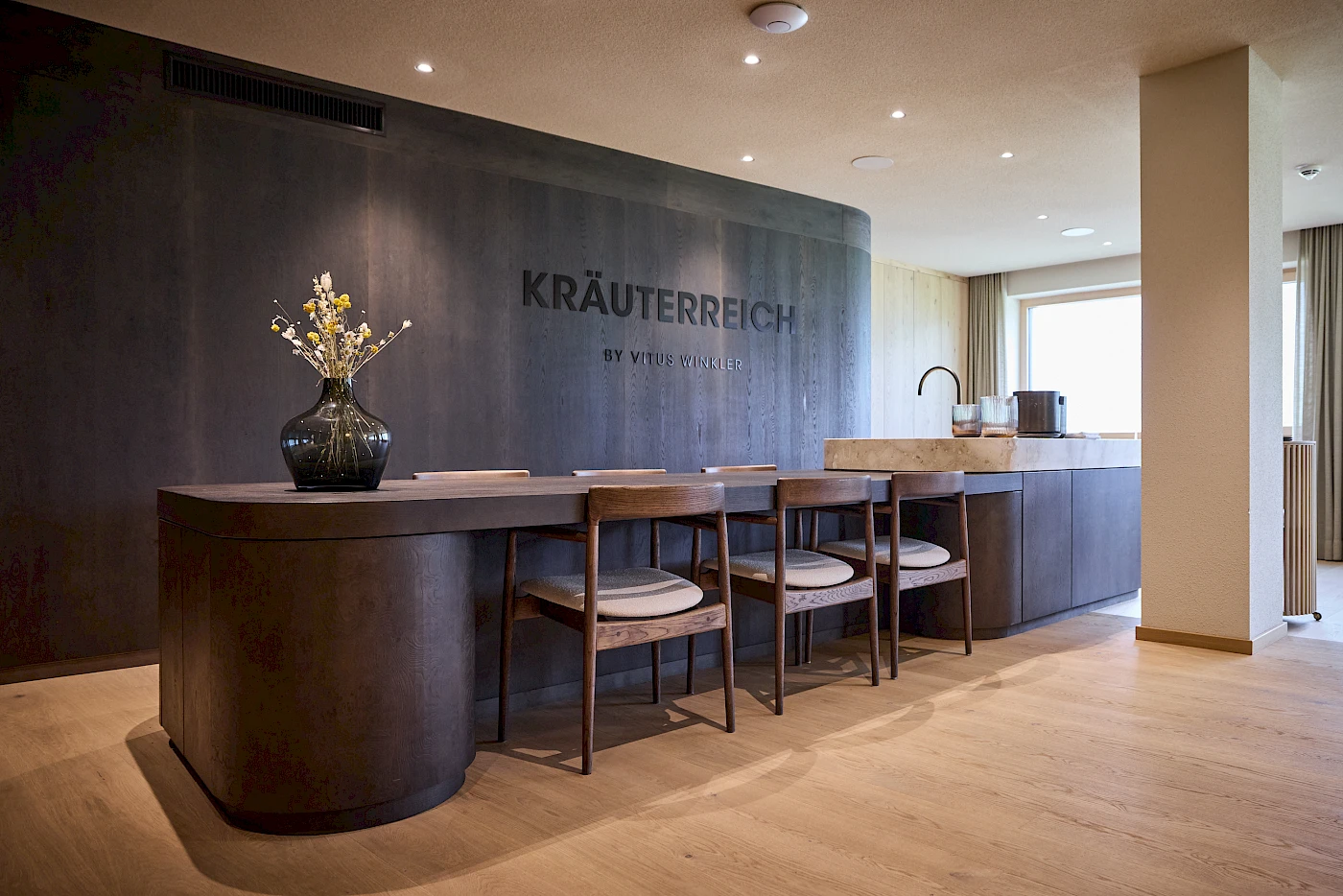 Das Kräuterreich ist wie ein kleines Wohnzimmer: puristisch eingerichtet, mit skandinavisch-japanischem Einfluss. Alles ist bewusst hochwertig und mit klaren Kanten gestaltet, damit die Gerichte im Mittelpunkt stehen und die Bühne bekommen, die sie verdienen. Das gesamte Ambiente ist in warmem Holz gehalten und lädt die Gäste dazu ein, abzuschalten und eine gute Zeit zu genießen. Man sitzt bei uns „daheim“, muss sich um nichts kümmern und wird umsorgt – wie früher bei der Oma oder der Mama, wo man sich einfach fallen lassen konnte. Wir fragen die Gäste zunächst, wie viele Gänge sie möchten und servieren anschließend ein Überraschungsmenü. Das ist ein entscheidender Punkt: Wenn man nicht genau weiß, was kommt, probiert man auch einmal etwas, das man sich sonst vielleicht nicht ausgesucht hätte. Und das Beste daran: Wir dürfen in der Küche unserer Kreativität freien Lauf lassen.